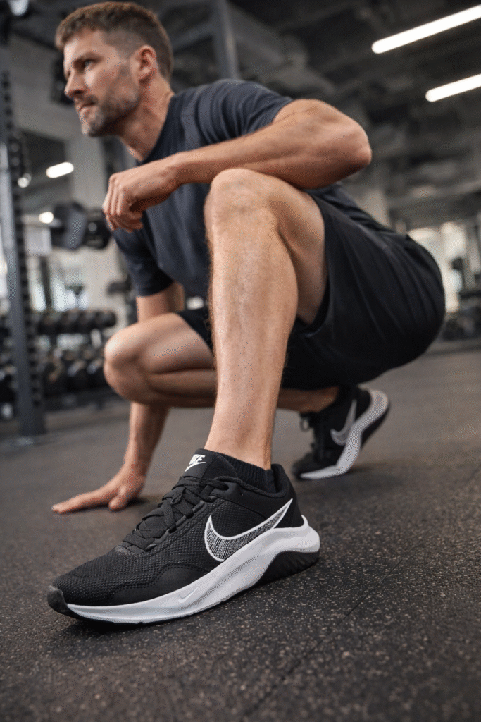Nike Legend Essential 3 Calcanhar plano para estabilidade no agachamento e solado flexível para agilidade. Quem busca versatilidade entre musculação e aeróbicos leves. Não é indicado para treinos de impacto muito elevado ou corridas longas.