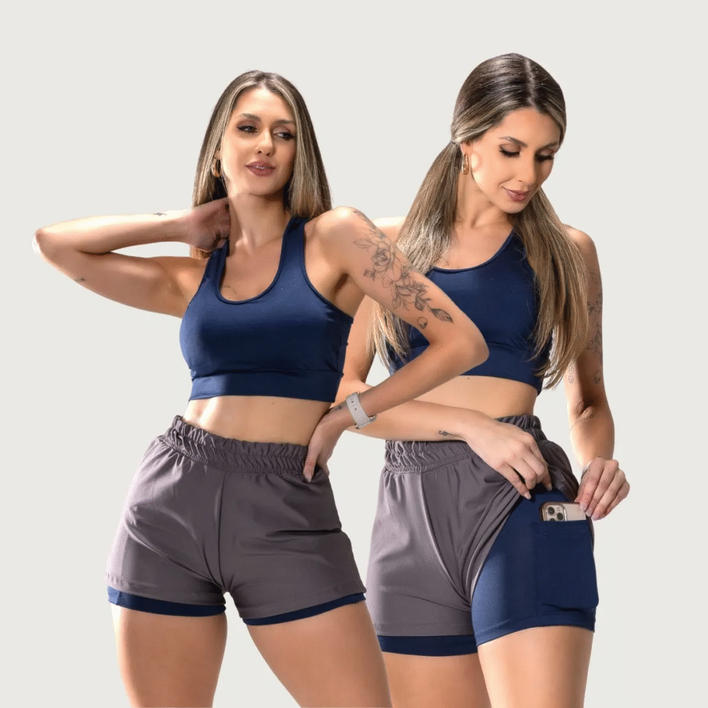 🏃 Conjunto Fitness Corrida Top e Shorts Duplo Bolso Elástico